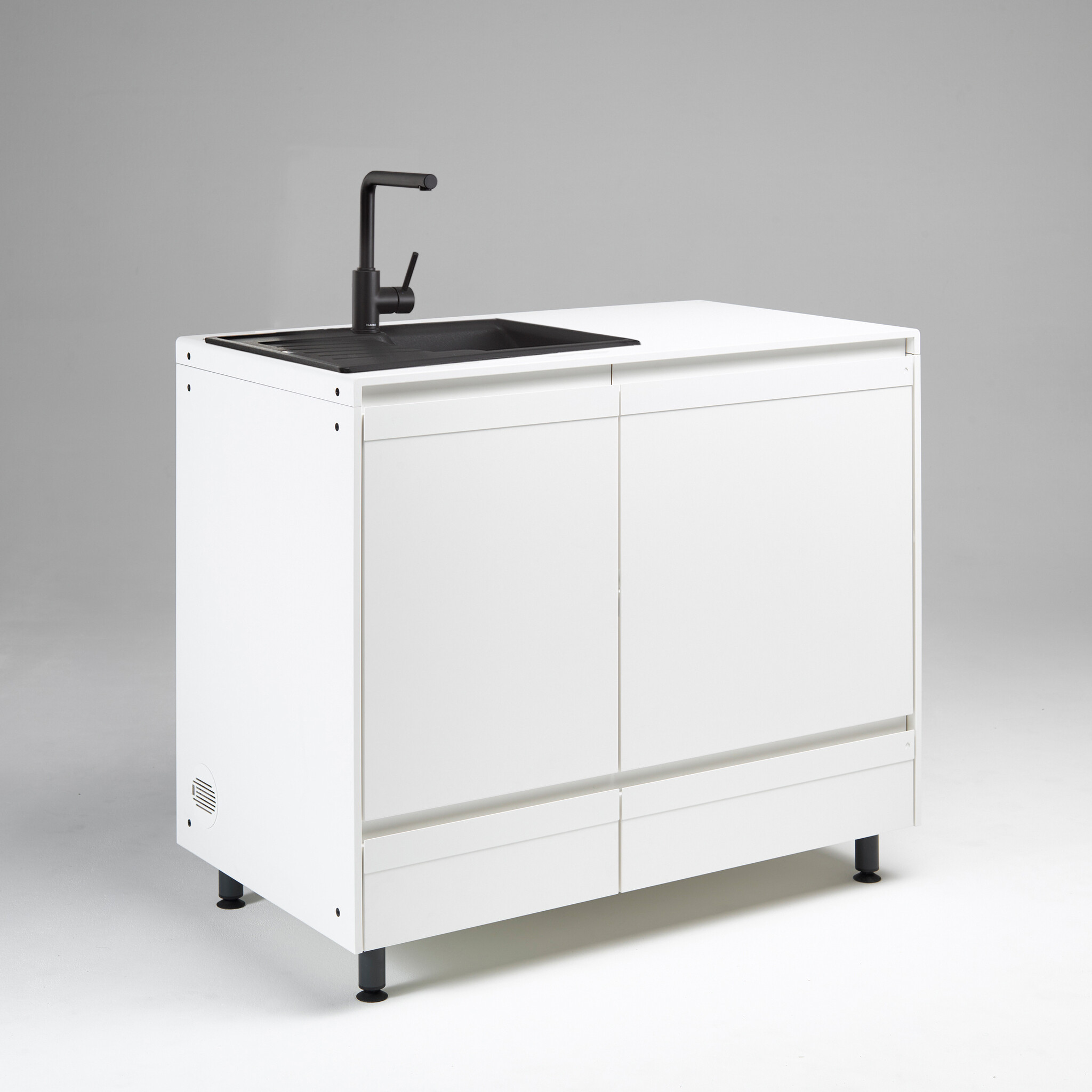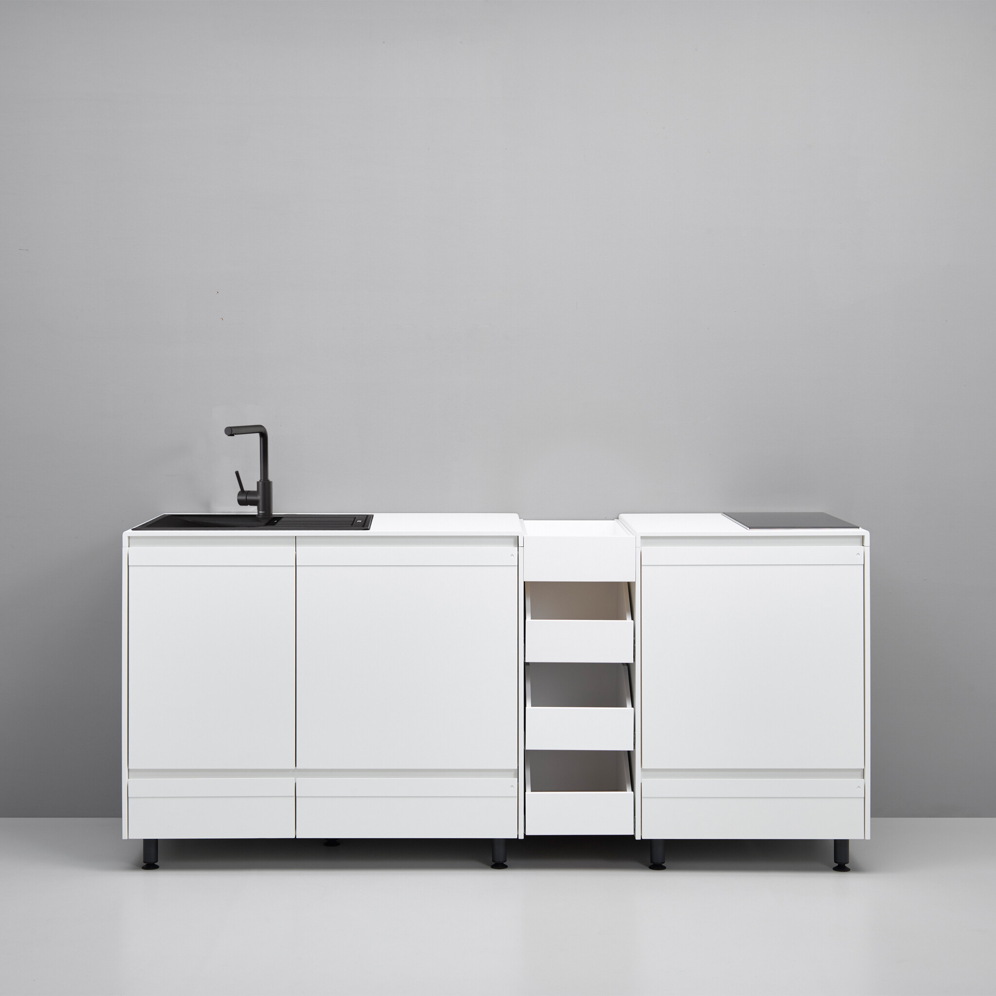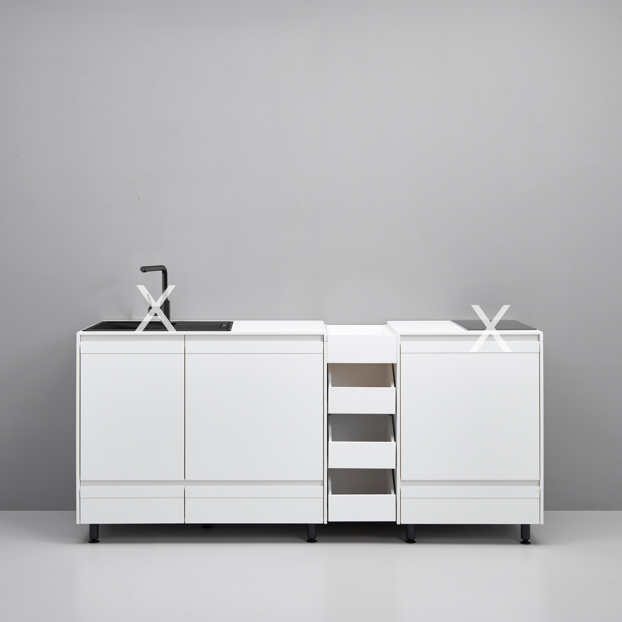 Entdecke die Modular Kombination für viel Stauraum, bestehend aus Modul 108 Spüle und Stauraum, Zwischenraum-Stauraum und Modul 63 Stauraum, hier dargestellt mit einem 2-Platten Kochfeld.
