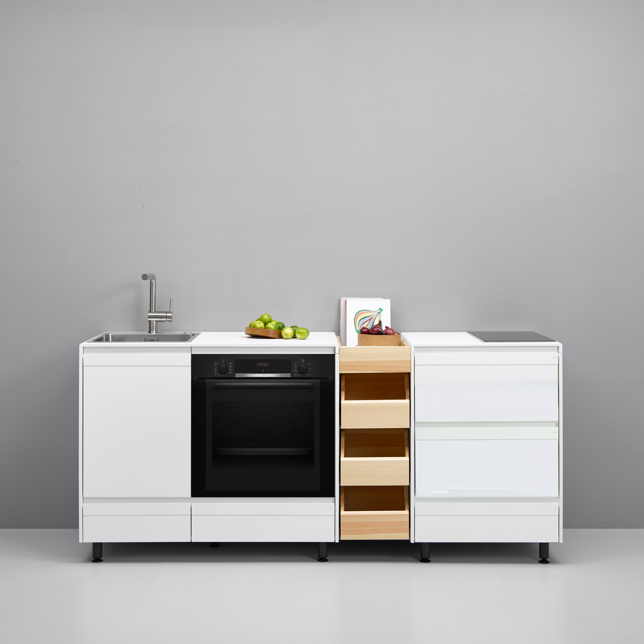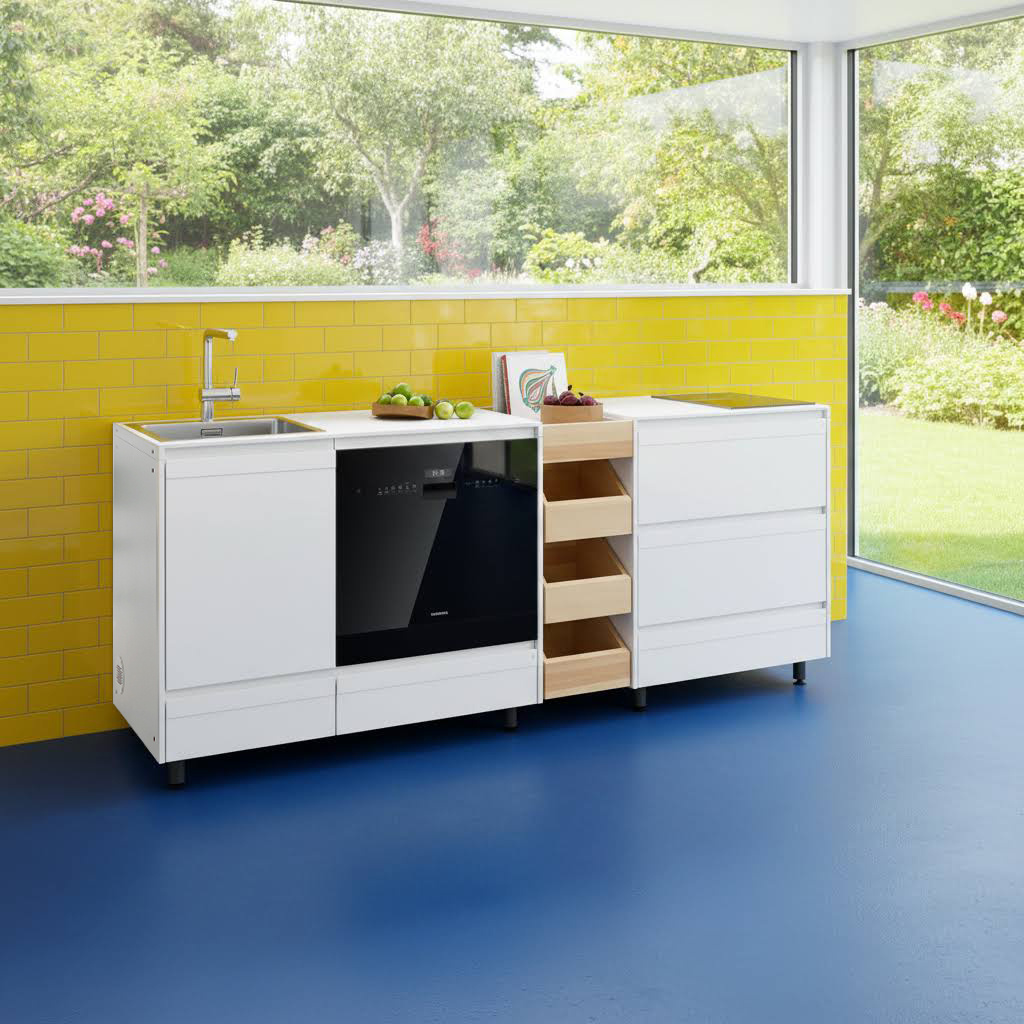 Entdecke diese attraktive Kombination welche alle Wünsche auf kleinstem Raum erfüllt. Sie besteht aus Basismodul 108 Spüle für Gerät, Zwischenraum-Stauraum und Basismodul 63 Stauraum2, hier mit 2- Platten Kochfeld.