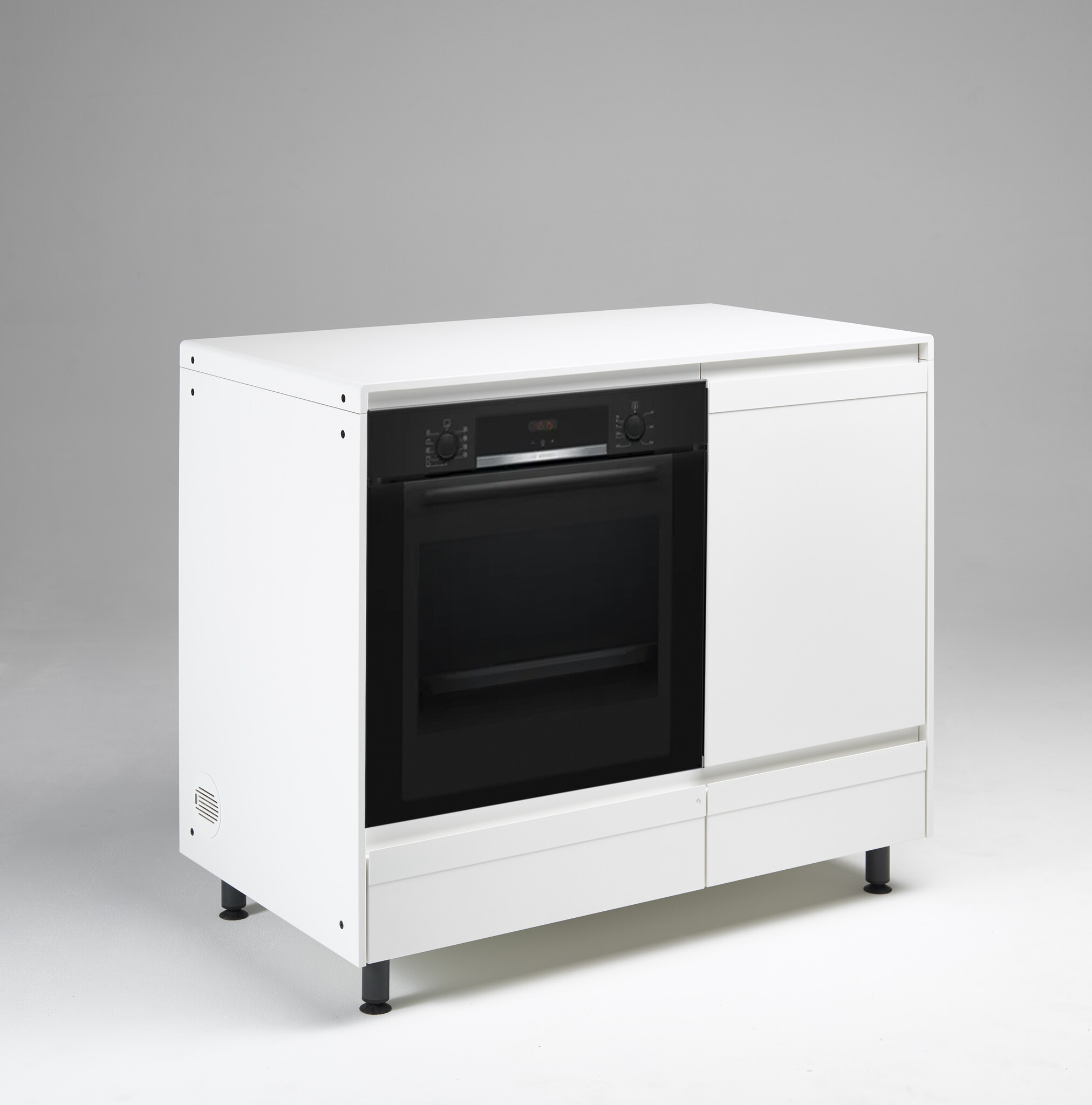 Entdecke unser Modular Basismodul mit großzügigem Stauraum hinter einer Drehtür (B45 cm) und einer praktischen Nische für Ihr Einbaugerät (B60 x H60 cm).