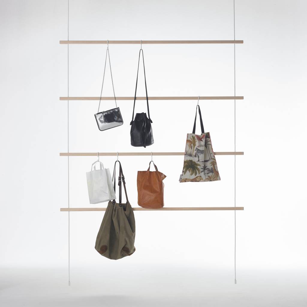 Die schlichten Holzstangen wirken wie aufgefädelt auf dem hochwertigen Seil. Die unauffällige Verbindung der Elemente unterstreicht das zurückhaltende Wesen des Raumteilers. Wirken soll schließlich, was über oder an die Stangen hängt. Dabei bietet der Faule Strick in seiner Einfachheit allerhand Möglichkeiten für spannende Arrangements. Kombiniert lassen sich die Stangen auch über Eck aufhängen. Durch die verstellbaren Auflager lassen sich individuelle und präzise Abstände einrichten. Ein zusätzliches Haken-Set macht den Faulen Strick auch für andere Schauplätze als Raumteiler (Küche, Bad oder Flur) passend.