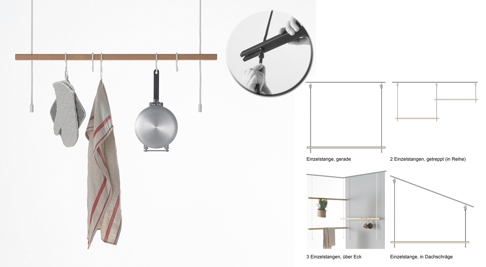 This casual and open type of suspension is simple and elegant: Feiner Strick is a versatile piece of small furniture that can be used to add accents to various living areas. The simple wooden rods can be arranged flexibly – across corners, in rows, or at different heights. The adjustable supports allow for precise spacing and individual adaptation to the room. This creates functional and at the same time creative solutions, exactly as required. The minimalist appearance is supported by the subtle connection between the elements. The focus remains deliberately on what is hung up – whether with classic hangers or the optional hook set. Both in your own four walls and as a stylish coat rack in a boutique window.