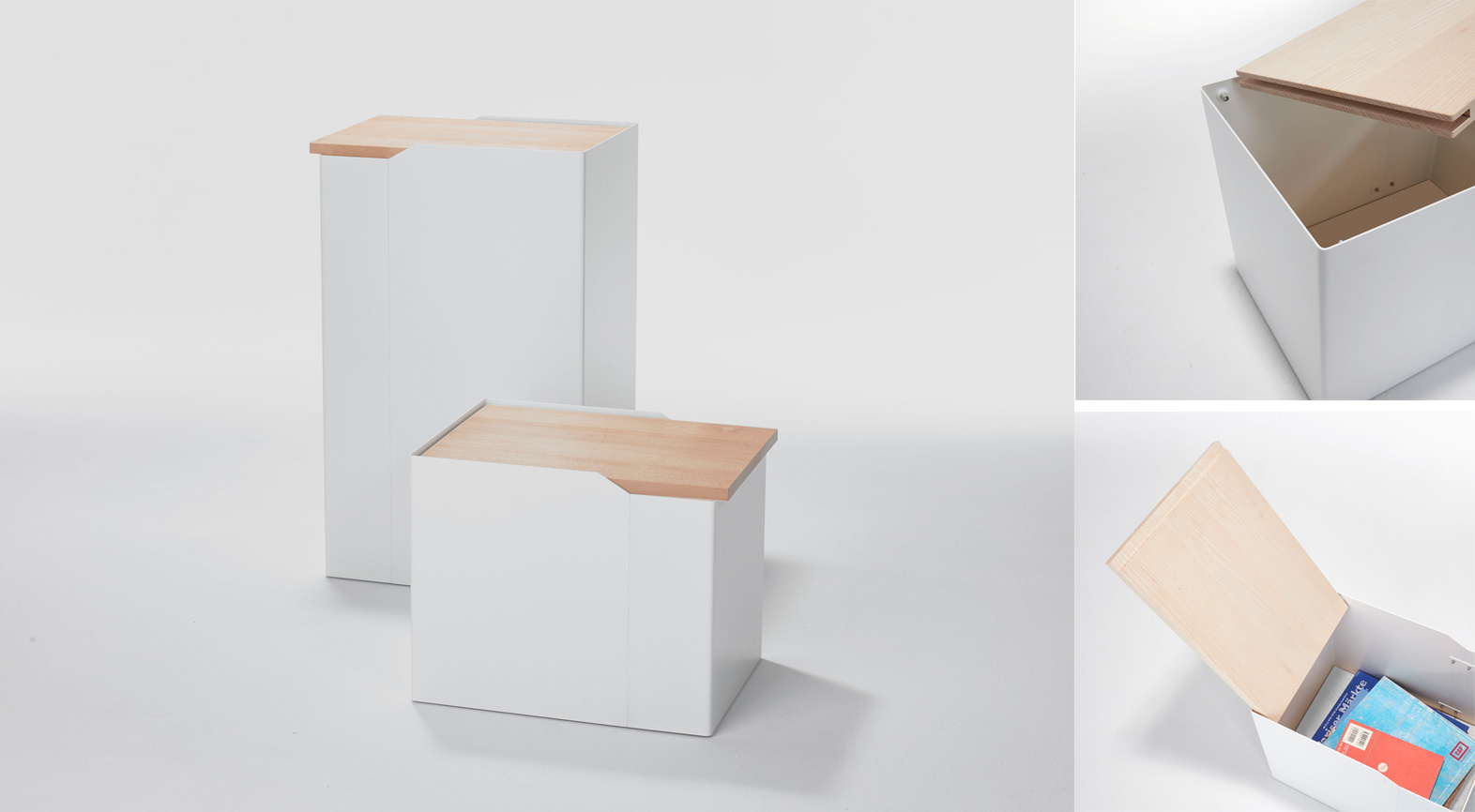 The contrasting mix of white container and hinged wooden lid gives it a graphic presence that works in any room – without being loud. The minimalist color scheme and precise geometry underline its universal character. The removable lid with integrated hinge solution is easy to open and is an elegant detail. Two sizes offer many possibilities: the tall version is ideal as a laundry basket, paper collector, or umbrella stand, while the lower version works as a side table, laundry box, or stylish magazine rack.