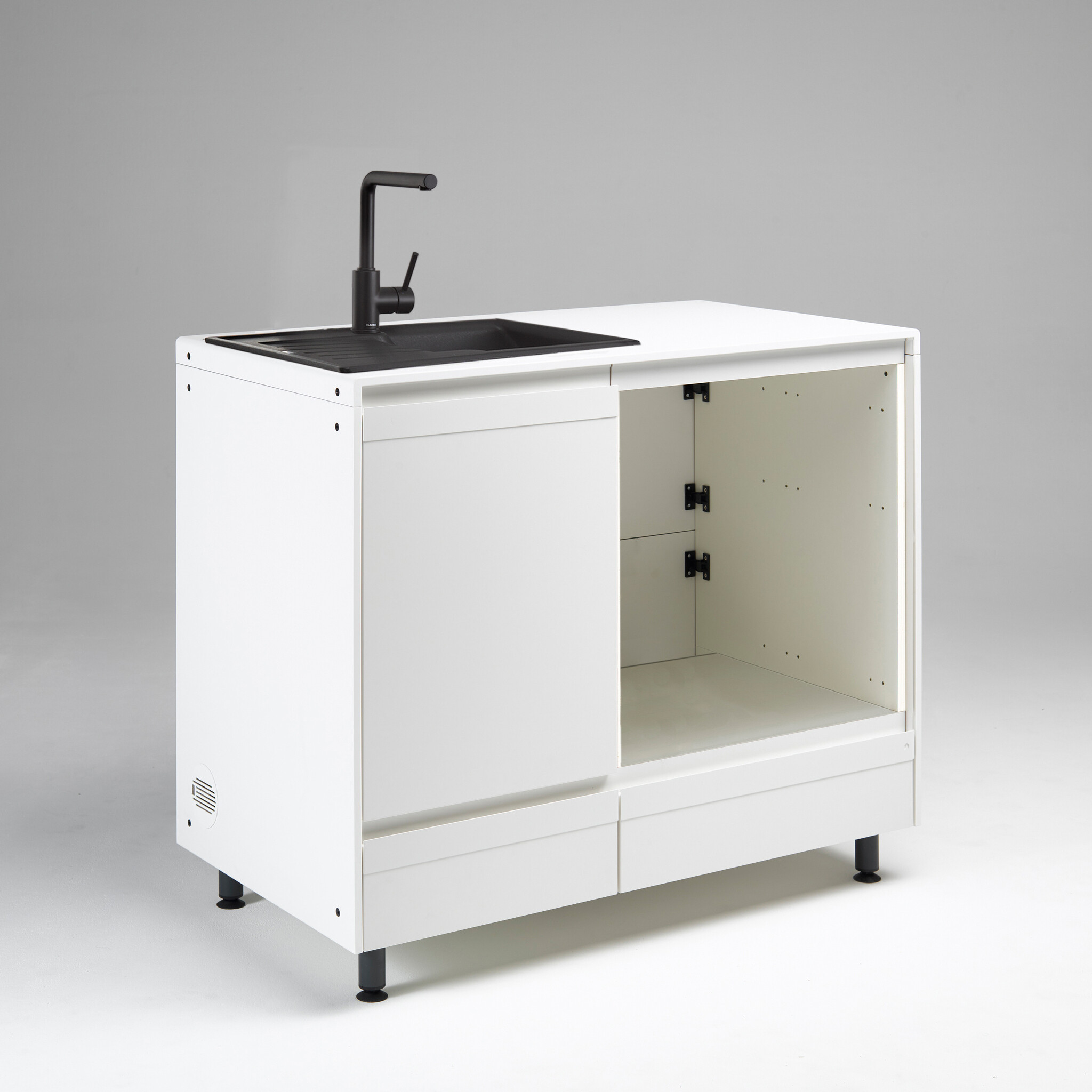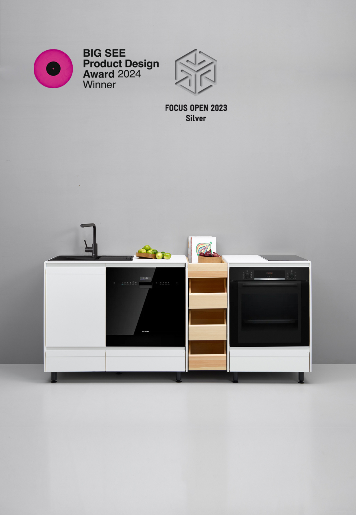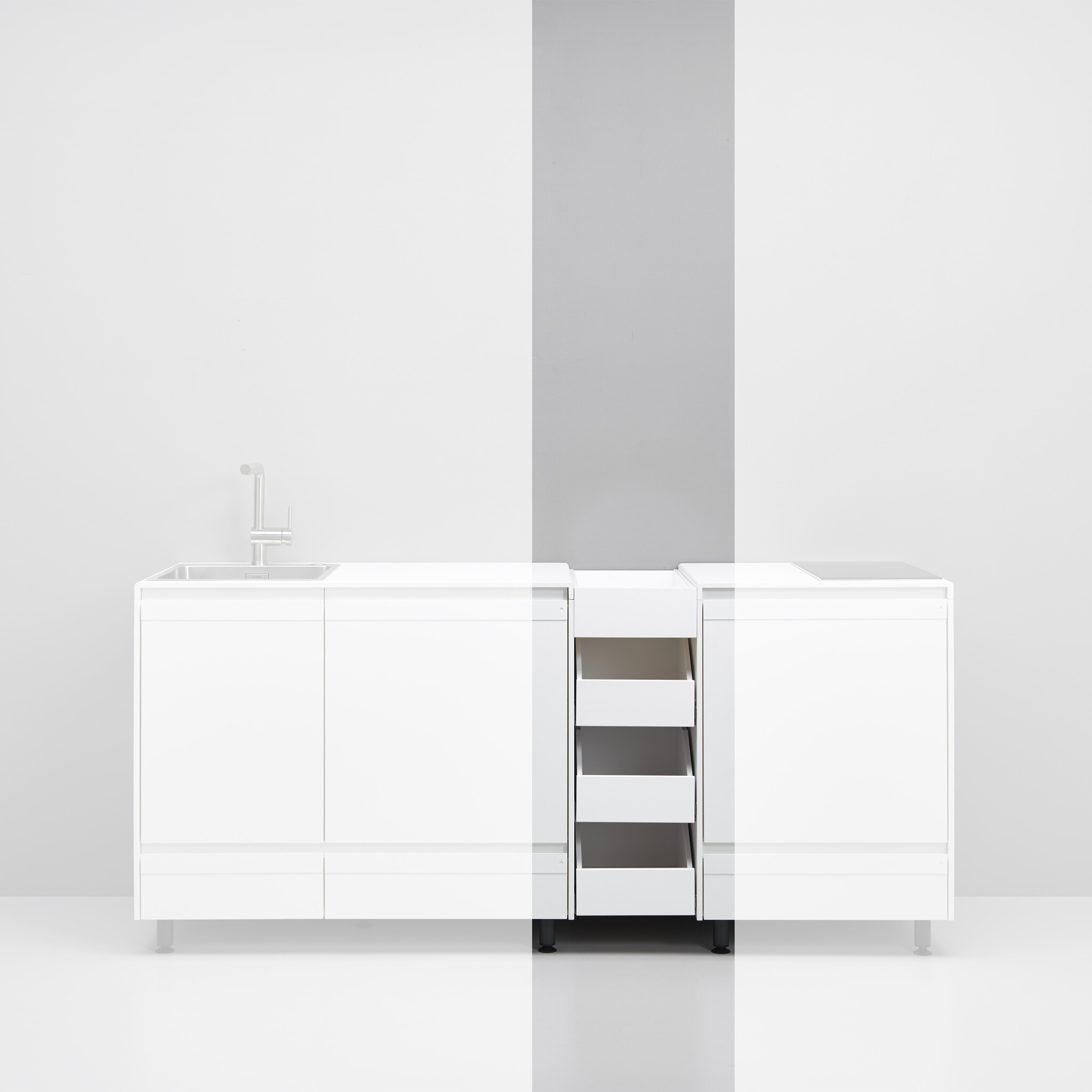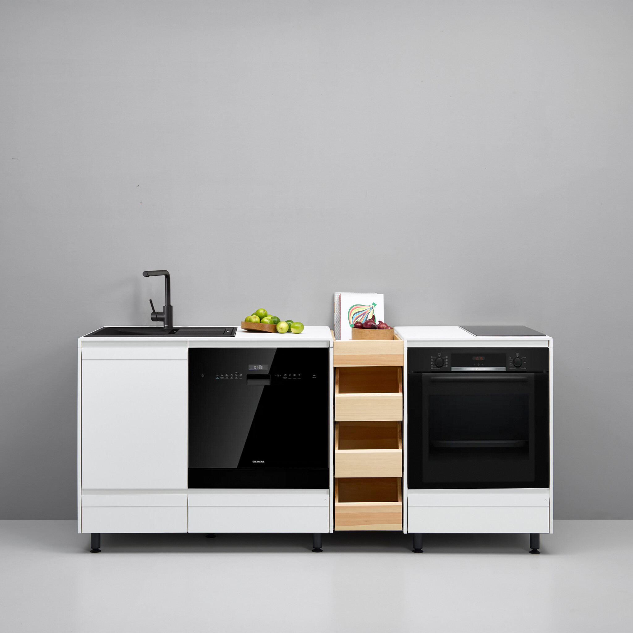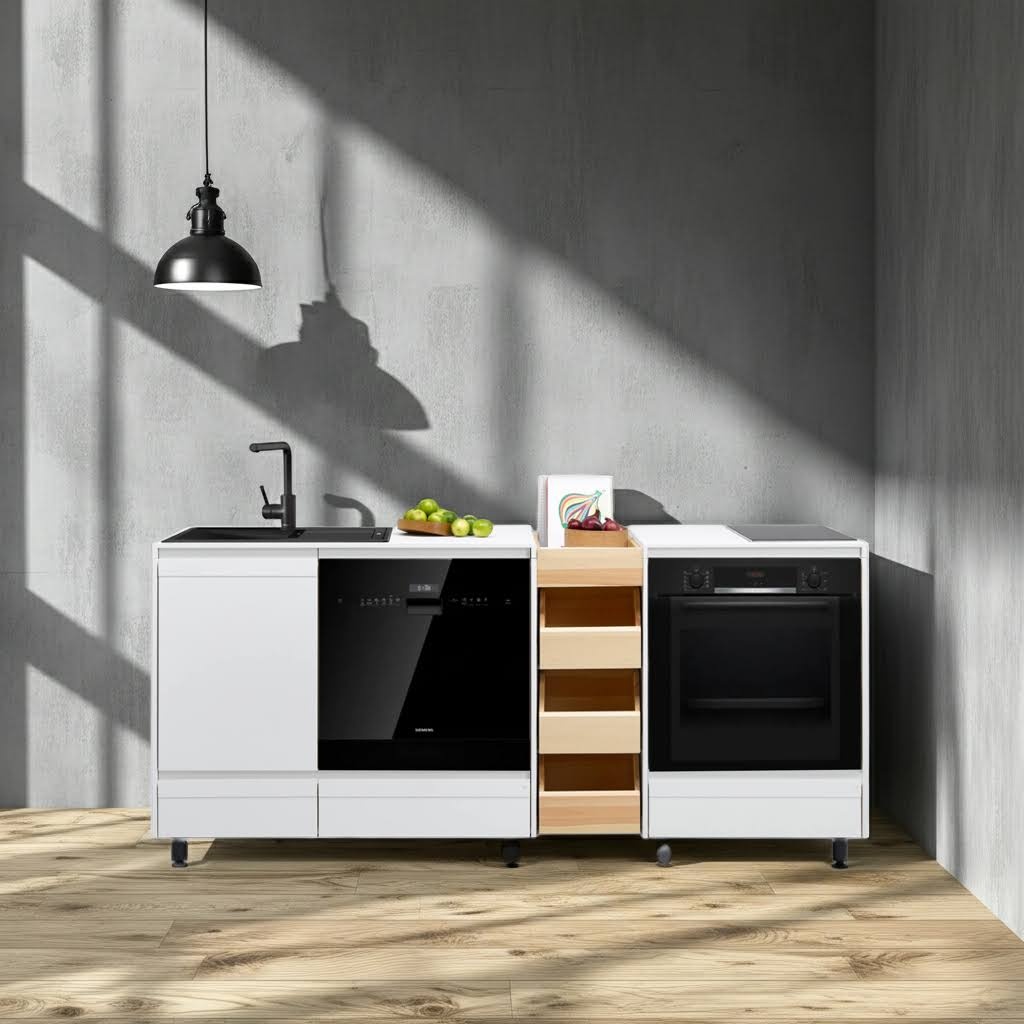 Discover our attractive combination which fulfills all necessities in a minimum of space, coming with Modular module 108 sink and dishwasher, interstice-storage and Modular module 63 for standard device, here shown with a 2-plate cooktop.