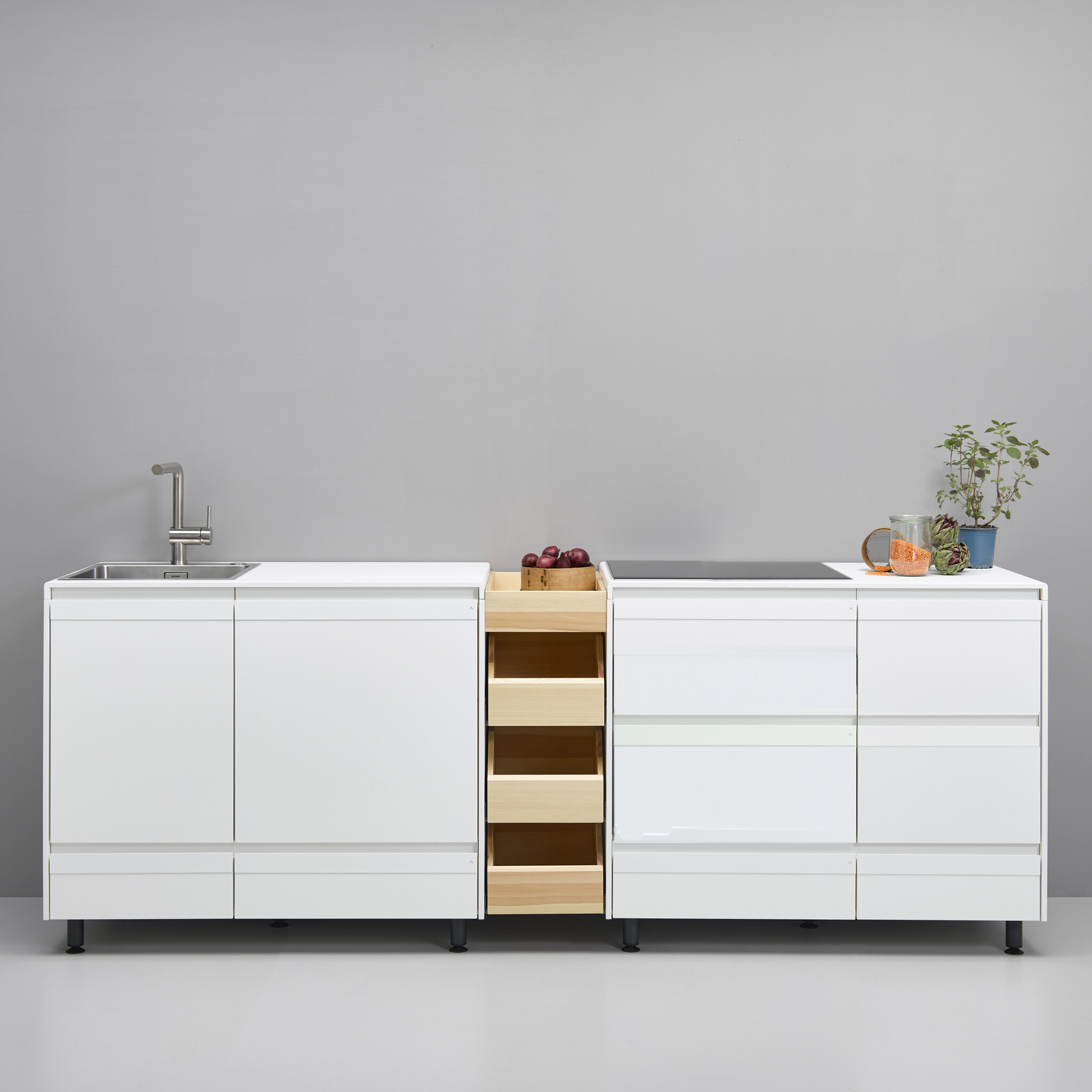 Discover the combination of the base module 108, featuring a sink and storage space, along with the base module 108 storage space 2, which is shown here with a 4-burner cooktop. An additional gap storage unit completes the set for a stylish kitchen.