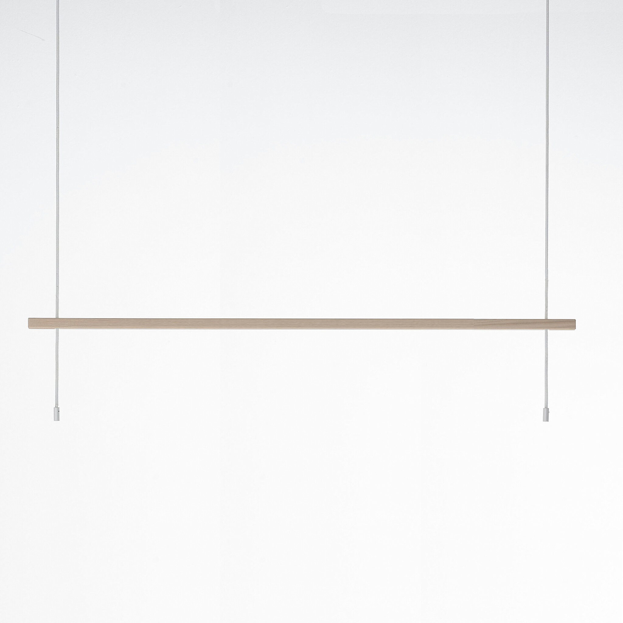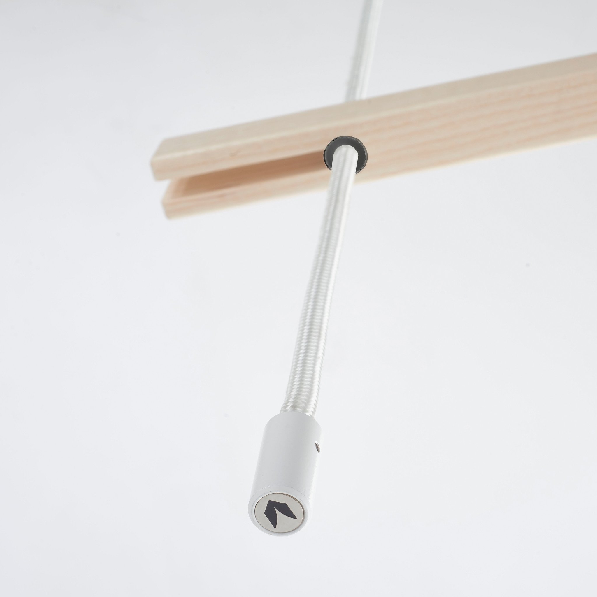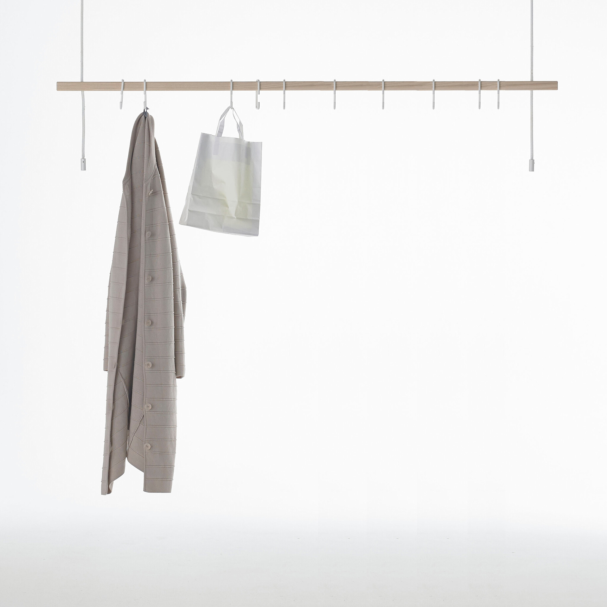 Placed in the corridor or sleeping room clothes and bags can be hung upon Feiner Strick both with common cloth hangers or with the optional hook set. Suspended in the kitchen cooking utensils and kitchen linens are staged in an eye-catching way. The unobtrusive linkage underlines the reserved product character. Displayed are the things that hang on the partition. In different combinations Feiner Strick comes up with imaginative arrangement possibilities. The plain wooden rails can be installed around a corner or in steps one after another. The adjustable mounts hereby allow individual and very precise intervals. Feiner Strick stands out through its simple and modern design: Striking equally in private homes and boutique display windows.