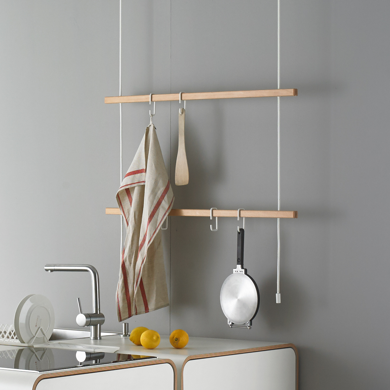 In different combinations several Feiner Strick or an additional single wooden rail come up with imaginative arrangement possibilities. The plain wooden rails can be installed around a corner or in steps one after another. The adjustable mounts hereby allow individual and very precise intervals. Feiner Strick stands out through its simple and modern design: Striking equally in private homes and boutique display windows.